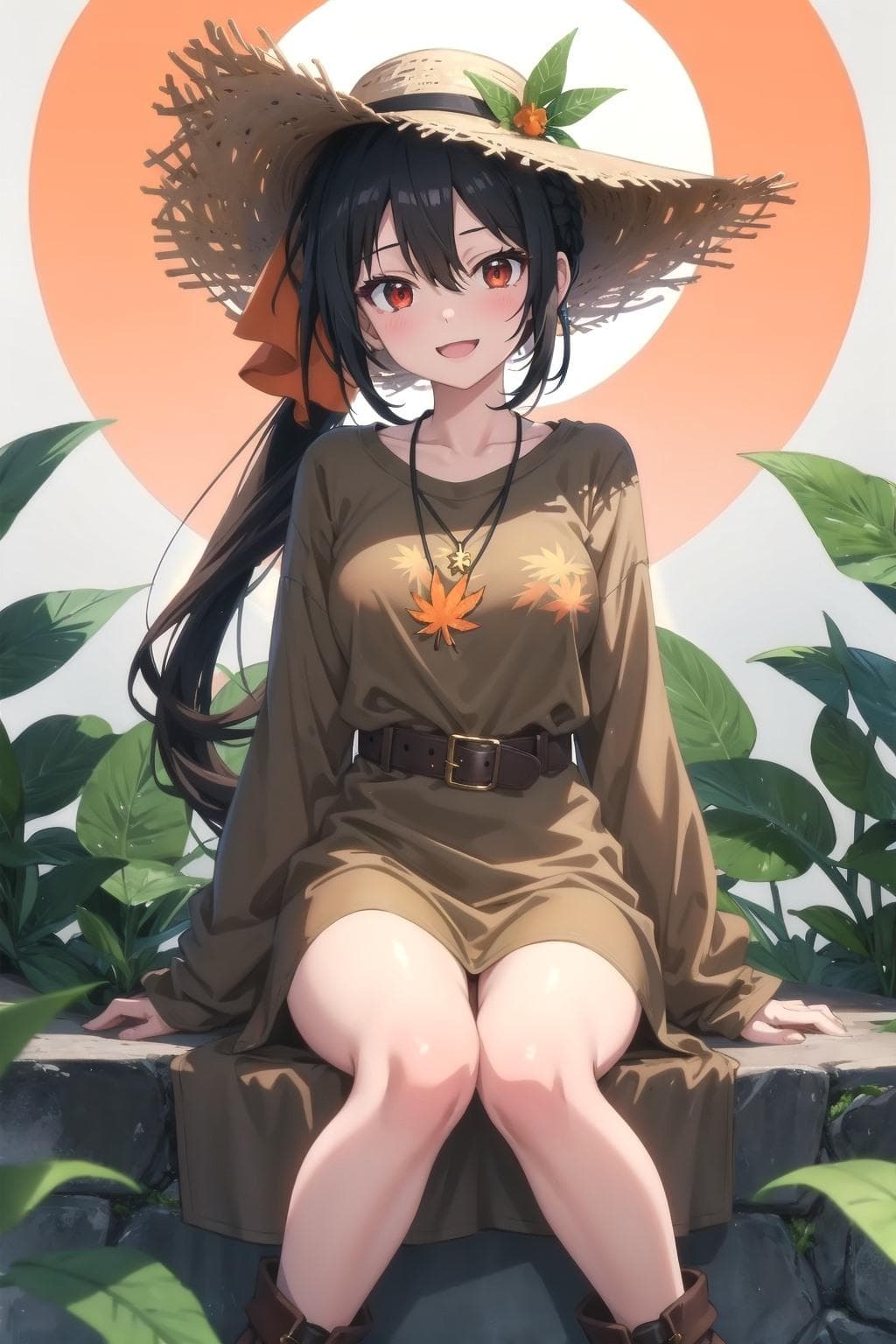 (green, brown, orange color palette:1.3),BREAK,(brown shirt dress with botanical leaf pattern:1.4),(green belt:1.2),brown ankle boots,(orange pendant necklace:1.1),(woven sun hat:1.2)