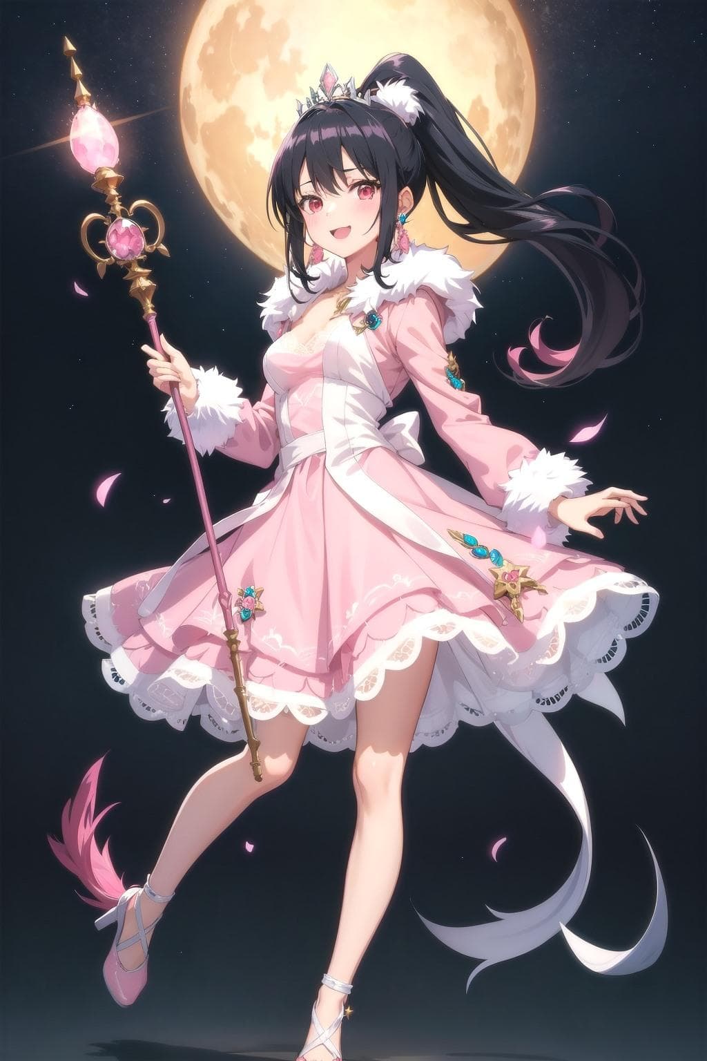 (white, pastel pink, crystal color palette:1.3),BREAK,(pastel pink tulle dress with crystal beadwork:1.4),(white lace gloves:1.2),crystal-studded heels,(candle-shaped earrings:1.1),(crystal headband:1.2)