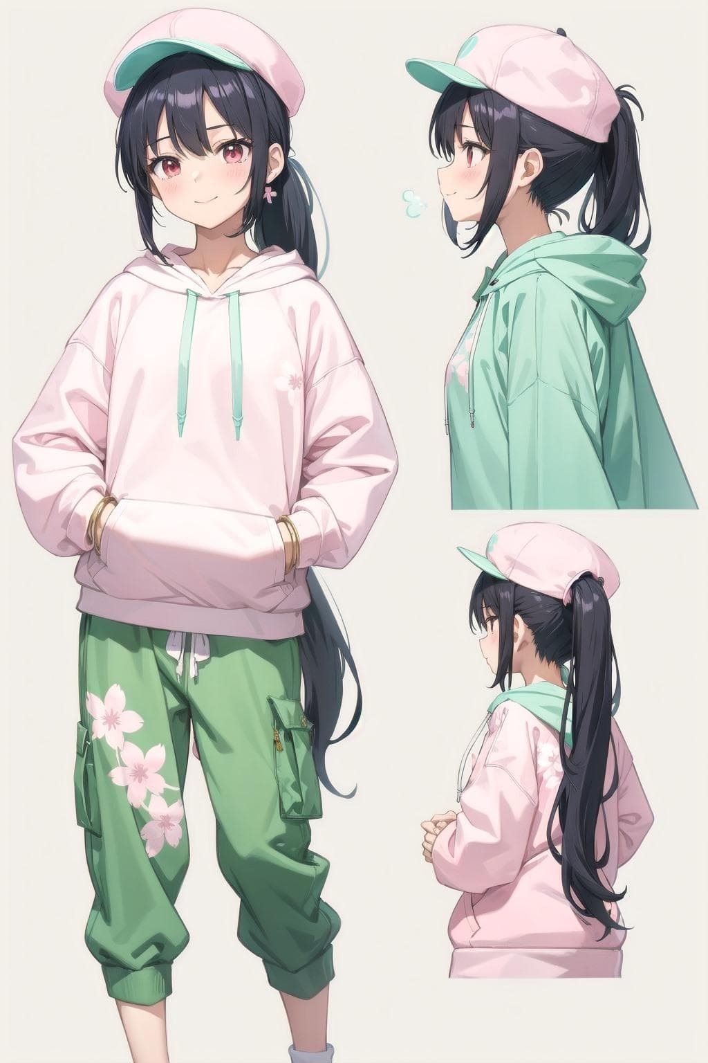 (pastel pink white mint green color palette:1.3),(pastel pink hoodie with white sakura print:1.4),(mint green cargo pants:1.2),white sneakers,(pink sakura cap:1.1),(white and pink floral bracelet:1.1)