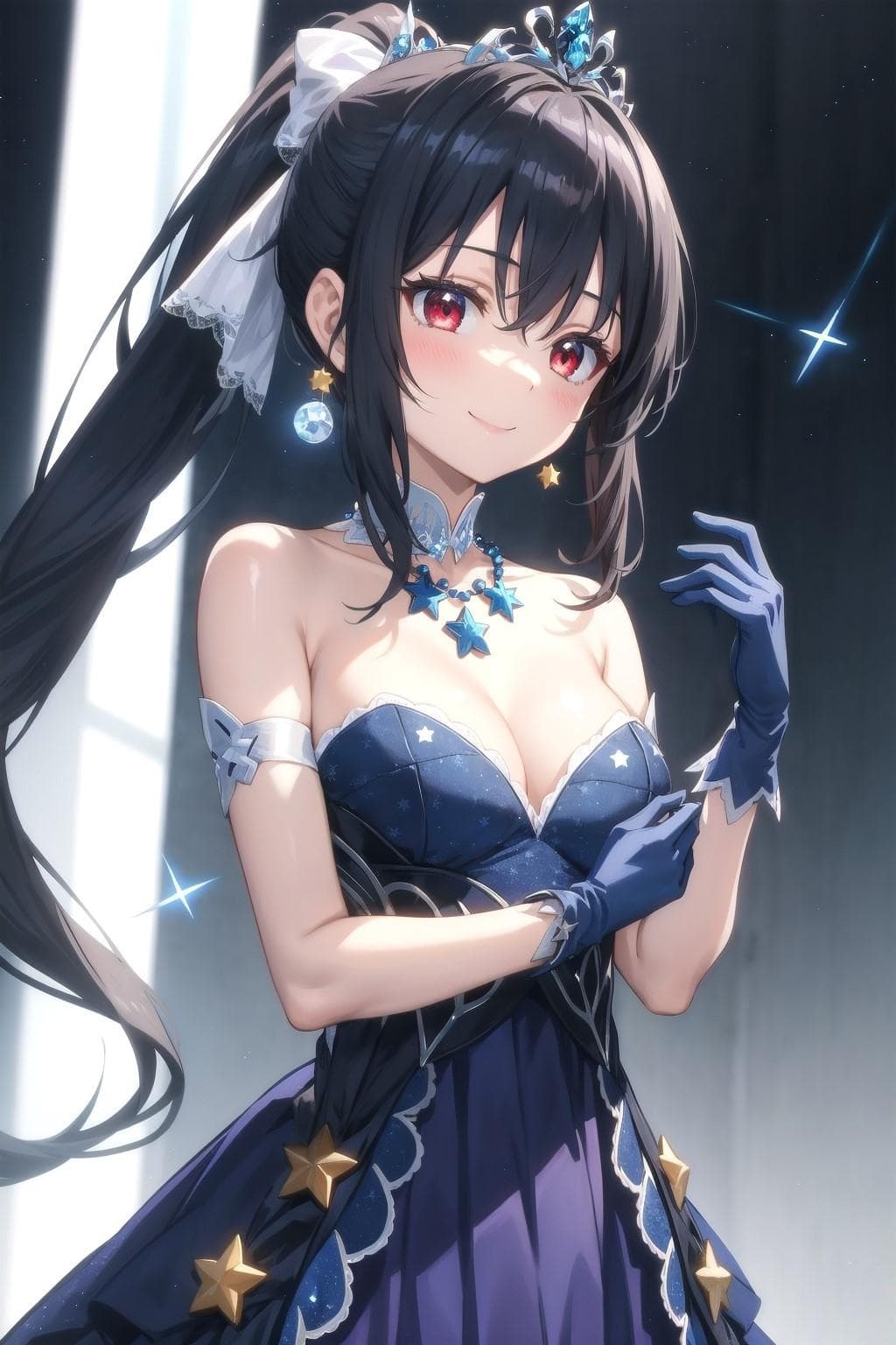 (midnight blue white silver color palette:1.3),(midnight blue gown with silver star pattern:1.4),(white lace gloves:1.2),(silver tiara with gemstones:1.1),(blue and silver beaded necklace:1.1),(white feathered hair accessory:1.1)
