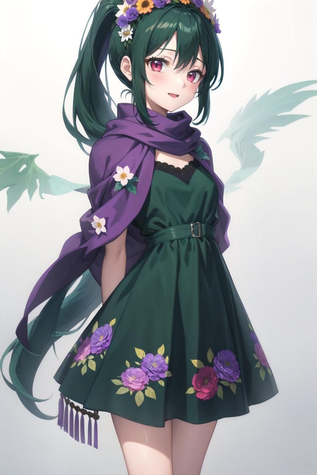 (dark green, purple, misty color palette:1.3),(Dark green dress with purple floral pattern:1.4),(Misty shawl:1.2),(Misty flower headdress:1.2),Purple velvet heels