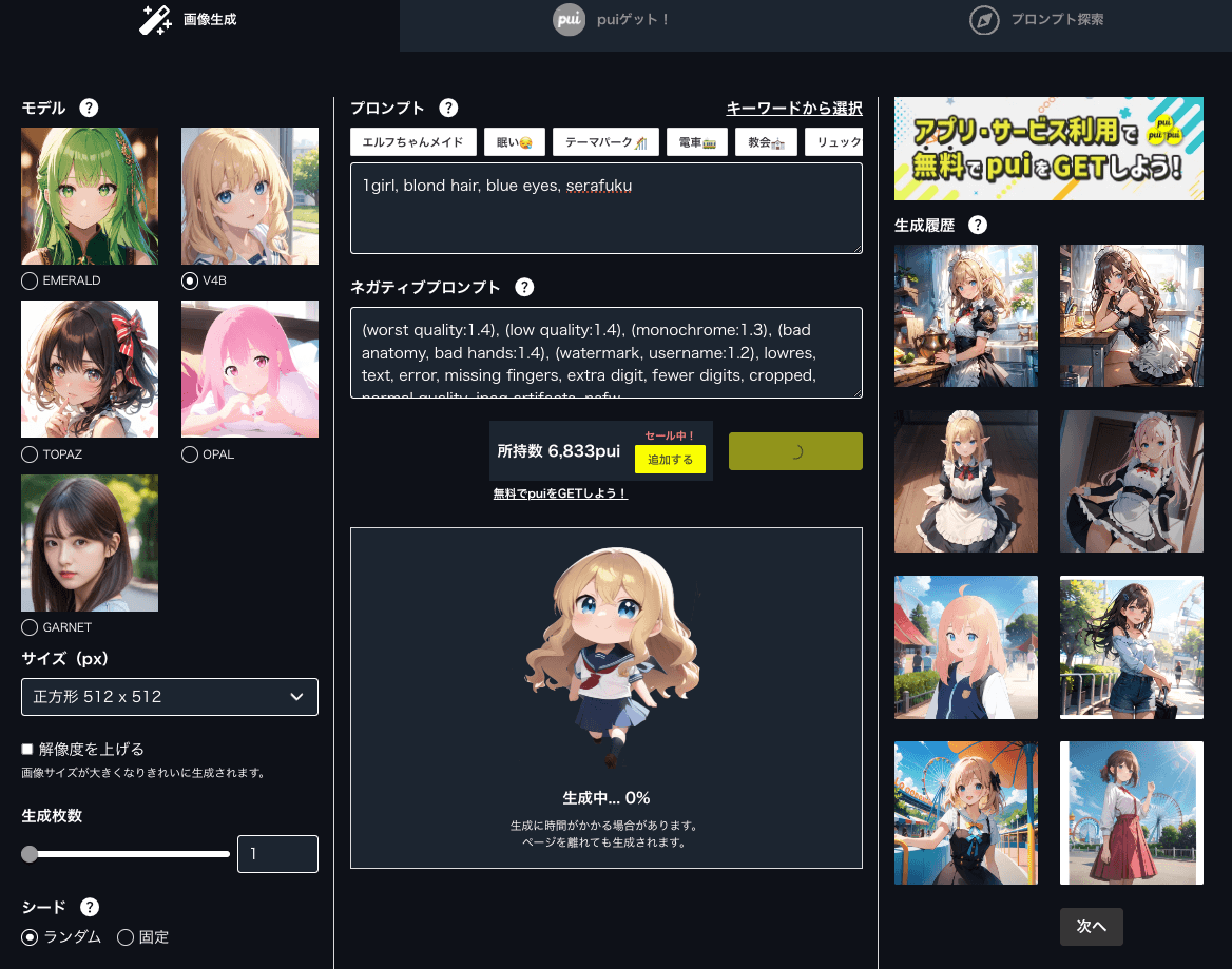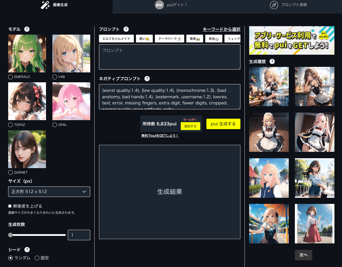 | 料金 | 基本利用:無料(毎日最大10枚生成可), サービス内通貨を購入することで10枚以上生成可 |