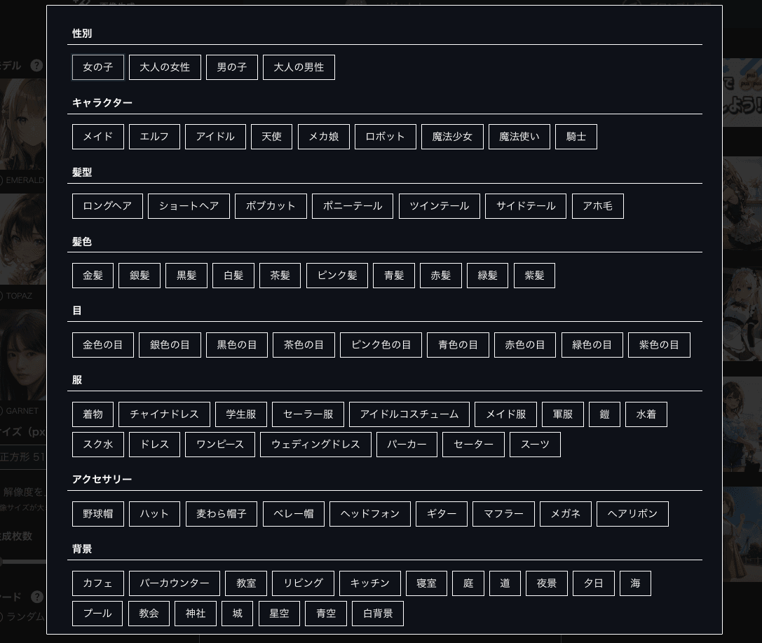 他にもプロンプト入力欄右上にある「キーワードから選択」をクリックすると、単語を選択するだけでプロンプトが作れるので初心者のかたにおすすめです。