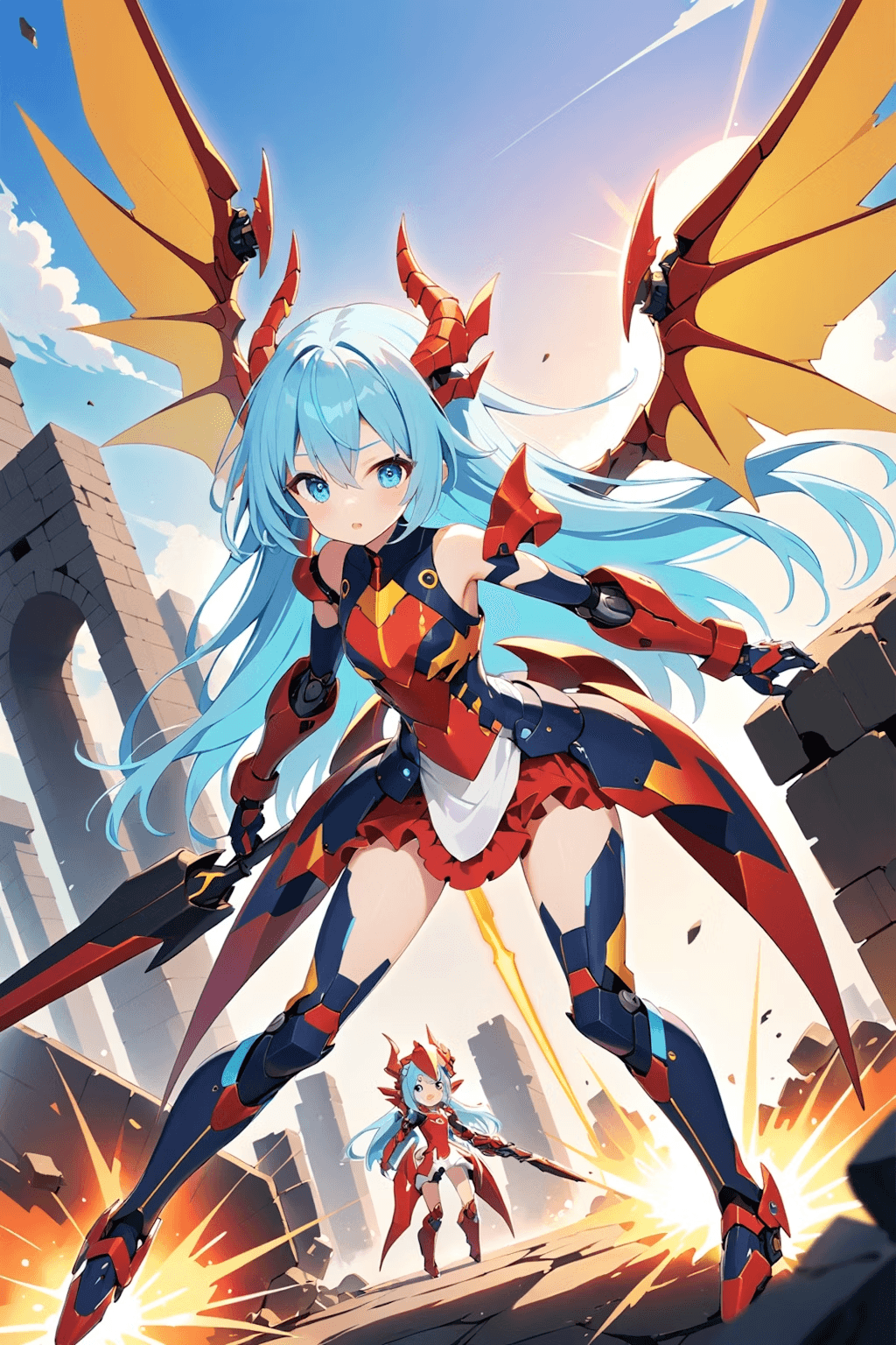 1 cute dragon android girl,(Mechanical dragon wings:1.1),(Mechanical body:1,2),machine dragon hones,light blue hair,very long hair,frill dress,machine clothes,battle,dynamic angle,ruins,