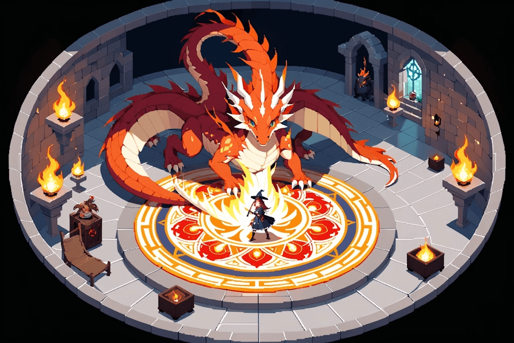 Absurdres, Highres, Ultra Detailed, Pixel Art, Dungeons, Fire-Fighting Dragon, Witch and Dragon Fighting, Magic Circle, Witch Who Begets Magic