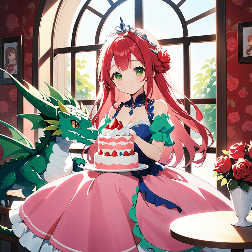 1girl, princess, tiara, pink dress, lace frills, sitting at cafe, eating strawberry cake, happy smile, fresh red roses background, sunlight shining through roses, delicate hands holding fork, cake topped with whipped cream and strawberries, her pet dragon waiting outside, green dragon with red wings, dragon curled up napping, puffs of smoke from dragon's nose