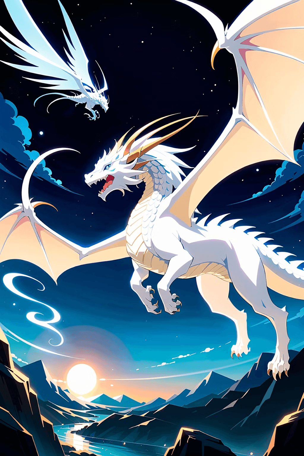 night view,fantasy, not human,white and blue dragon,flying over the sky