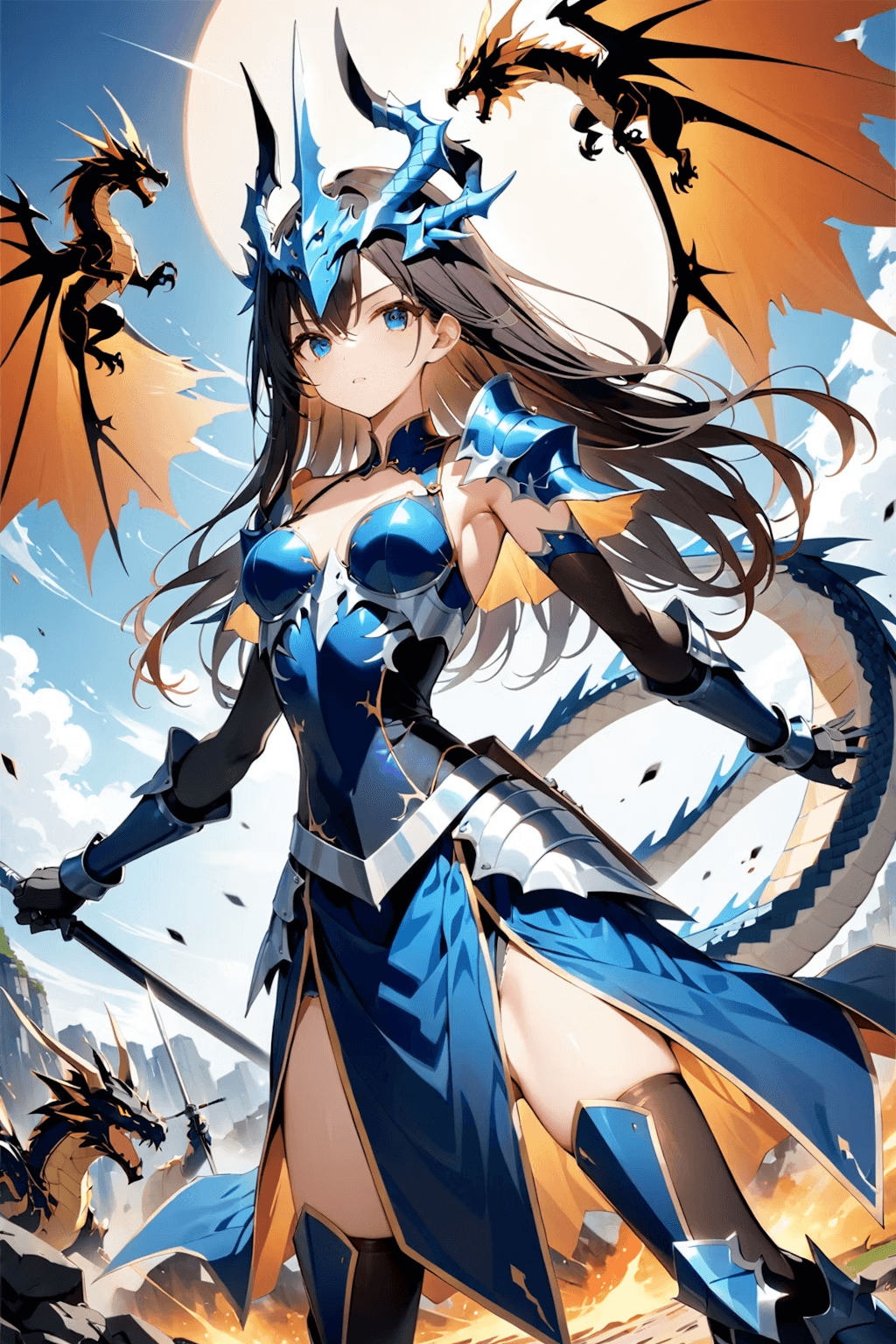 (dragon girls), (dragon:1.2), (dragon Knight), (armor), (dark blue metal armor), (fade blue armor), (dark blue gauntlet:1.2), (dark blue greave:1.2), (dark blue skirt), (fade dark blue helm), BREAK