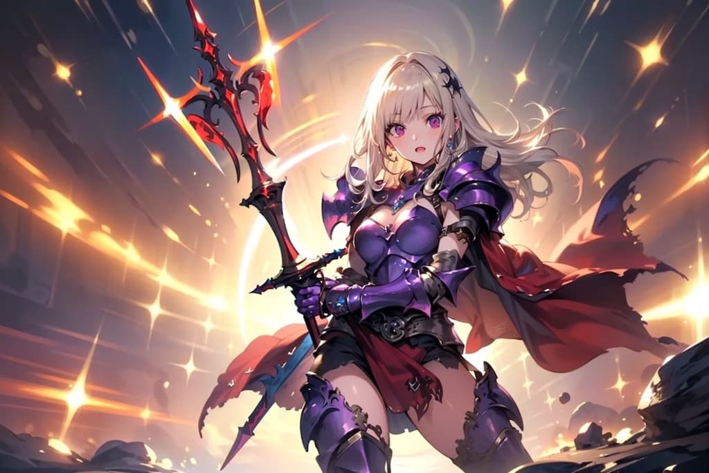 (Masterpiece, BestQuality:1.3), (ultra detailed 8k cg:1.2), (hyperrealistic:1.35), (Photorealistic:1.45), (realistic:1.4), (perfect anatomy), (sharp sketch, illustration:1.1), ((Demon Warrior Duke Arakes:1.5)), ((blonde, long hair)), ((man:1.5)), ((pointed ears)), ((Heavy armored right arm:1.5)), ((deep purple armor)), ((full body shot)), ((red cloak:1.3)), ((whole body deep purple heavily armored:1.5)), ((the lower body is deep purple heavily armored:1.5)), ((Sword hanging from waist)), ((green loincloth:1.2)), ((holding a magic spear in his left hand:1.5)), ((Spread your legs and raise your weapon)), (the background is a hells)