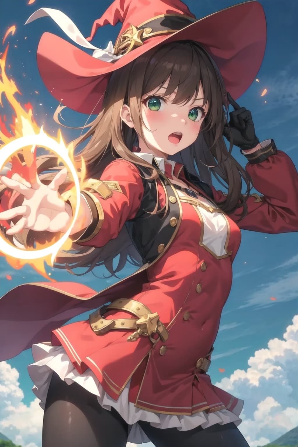 1girl, very cute girl, teen girl, brown hair, long hair, swept bangs, green eyes, breasts, light blush, concentrated look, open mouth, leggings, cowboy shot, stretching, standing, combat pose, dynamic pose, magician gloves, witch hat, witch dress, long sleeves, frilled dress, fantasy world style, casting magic, dire situation, flames is concentrated at hands, create a burning effect, red effect, magic circle, blazing flames, bomb blast lift , outdoors, burning volcano background