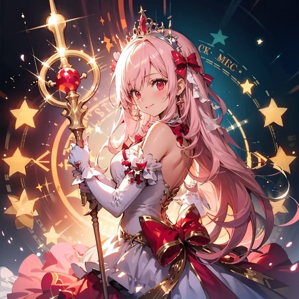 (best quality:1.2), (solo:1.3),(1girl, 24yo:1.3), (long straight hair:1.2),(hair pink:1.3),(red eyes:1.2), magical girl, magical dress,holding magical rod,(magic circle:1.2),magical tiara