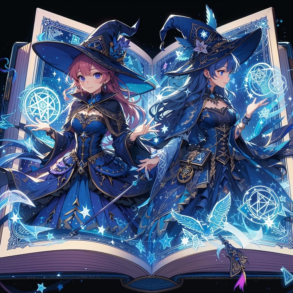 masterpiece, best quality, 8K, (photorealistic:1.4),(Vivid colors:1.3),(confident expression:1.3),Spellbook with a sapphire blue hexagram. A female swordsman of light and a female wizard of darkness. A shimmering magical door. A magic tablet. Exquisite animated illustrations. A world with an original and fantastical atmosphere
