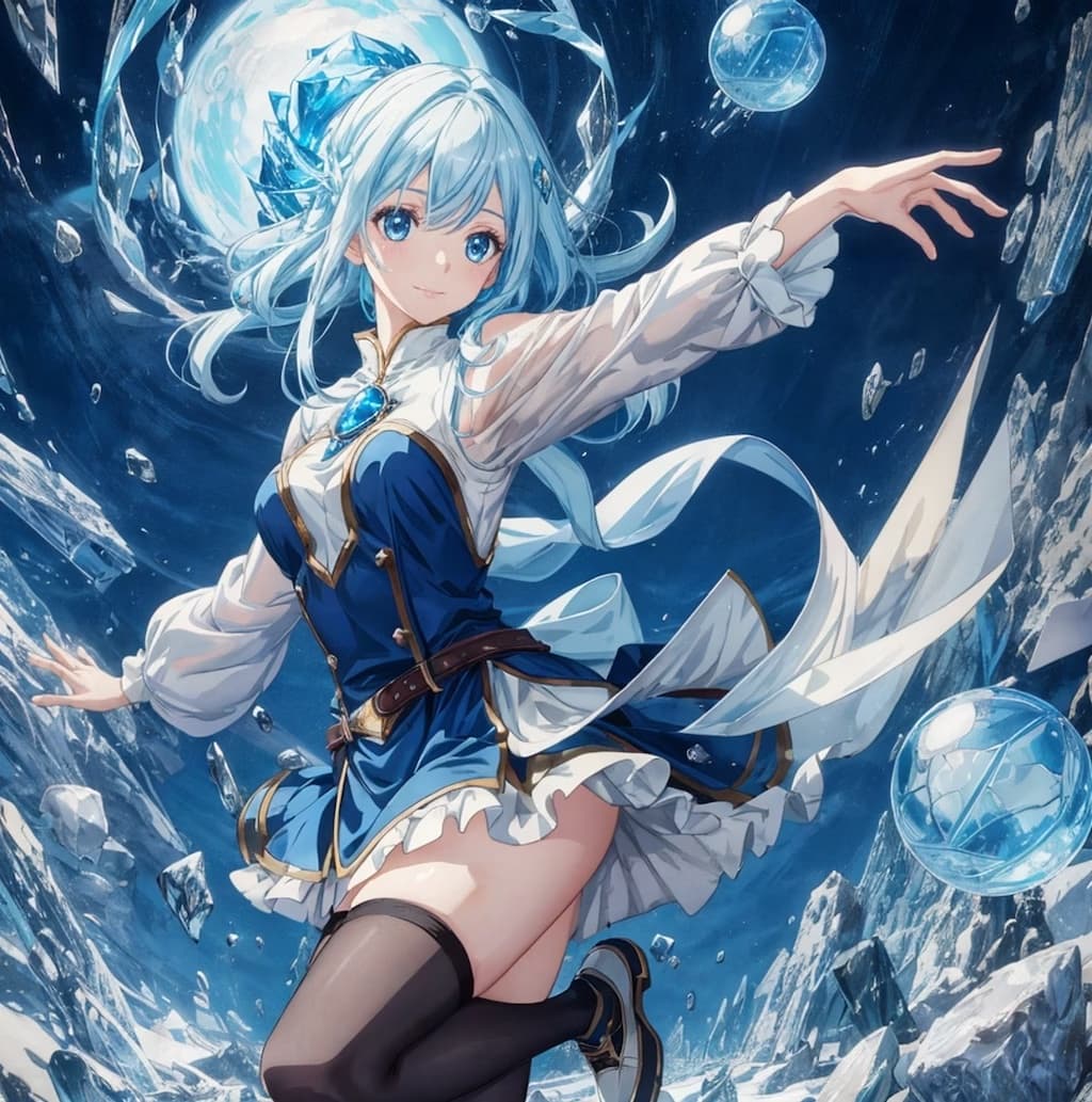 "In a whimsical fantasy art scene, a cute young sorceress stands alone, in deep contemplation. Surrounding her are numerous transparent, luminous glass spheres that hang in the air. A radiant blue magic circle casts an enchanting glow, illuminating the world in shades of blue. The scene is reminiscent of a cinematic experience, with dramatic lighting against a rich blue background and a sense of dynamic motion. Countless ice and glass shards dance gracefully through the air, creating an atmosphere of enchantment and wonder."