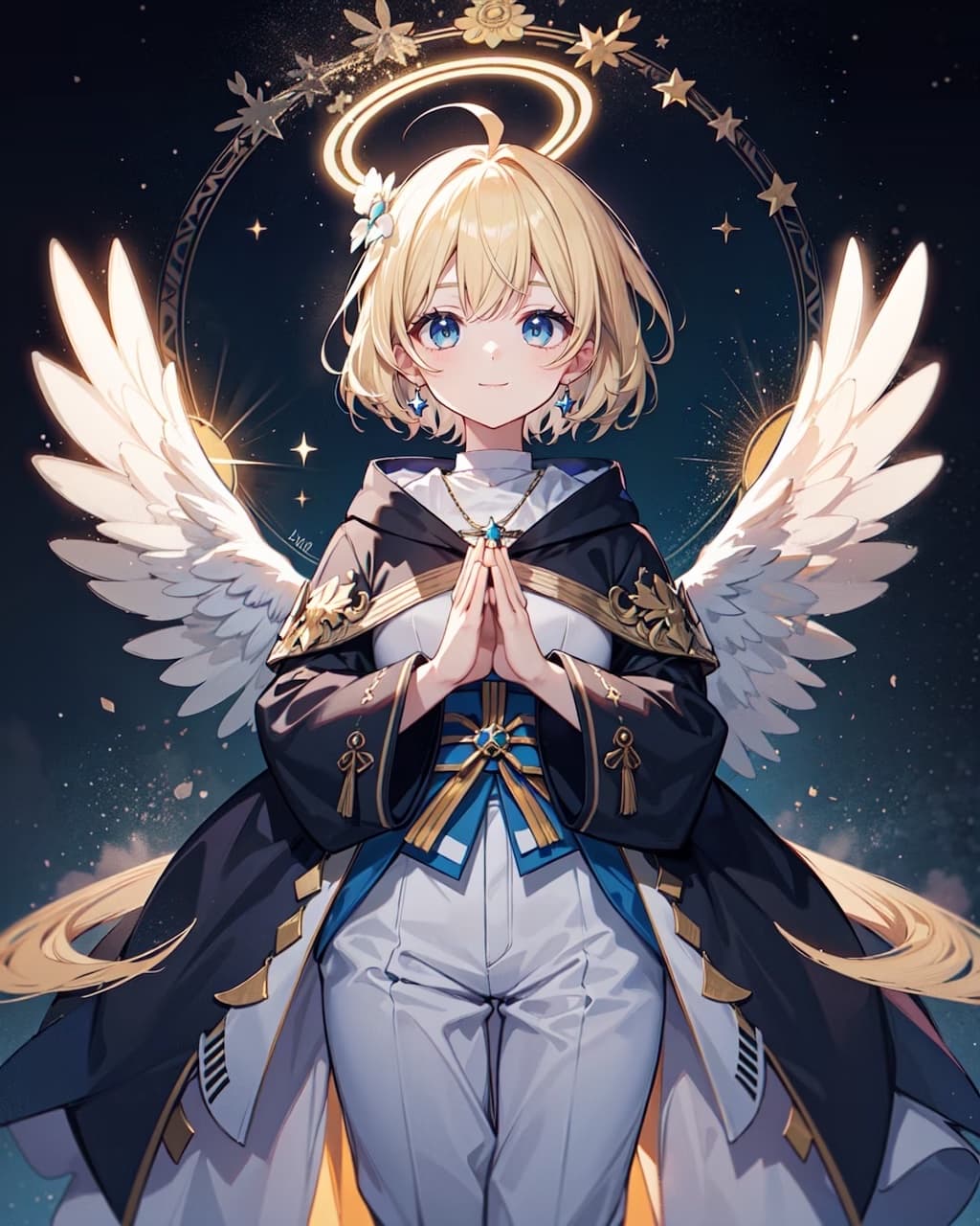 (masterpiece, 8k), (best quality, high quality:1.4), perfect anatomy, hyper detailed, ultra detailed,perfect design,1girl, solo,(join palms together, 17 years old, slender, small breasts, long sleeves, huge ahoge,light smile, closed mouth, priestess, blonde hair, short hair, blue eyes, white tabard, white long pants, hood down, Star pendant, obi, boots, slender girl:1.2), (praying,Angel's feathered wings, angel halo,shining circle:1.2), (front view,cowboy shot, looking at viewer,steam light, shining, aureole, illusion effect, magic effect, holylight,A large shining circle background),