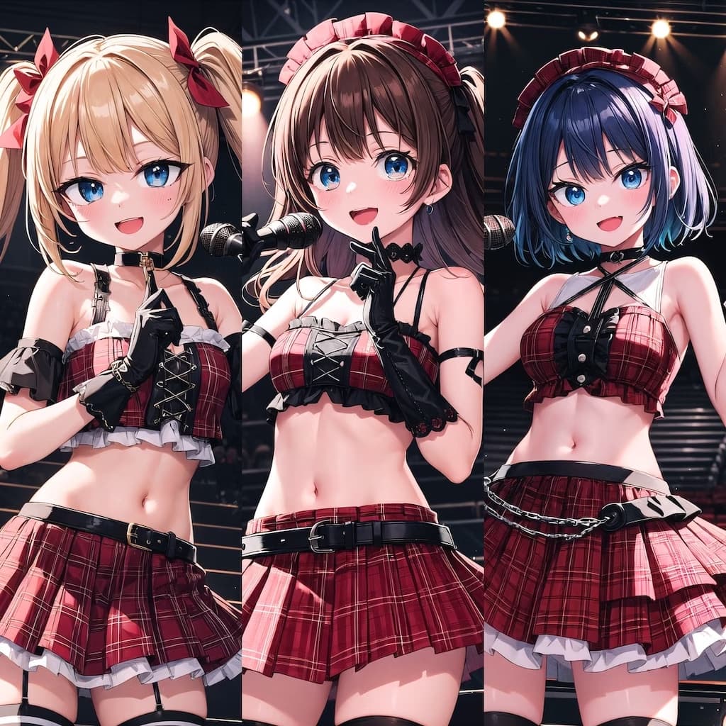 <lora:eyecolle_susuki_v100:1> insanely detailed, absurdres, ultra-highres, ultra-detailed, best quality, 1 girl, solo, nice hands, perfect hands, BREAK (black crop-top with ruffles:1.4), ((sleeveless, bare shoulders):1.3), (navel, collarbone:1.2), ((black opera gloves, black long gloves):1.3), ((ruffle-skirt, multilayer-skirt):1.3), (red tartan-check pleated skirt:1.4), (black and white (striped-pattern over knee socks):1.3), (red lace-up boots:1.2), (choker, Bangles, chain, silver accessories:1.2), BREAK happy smile, laugh, open mouth, singing, holding microphone, 45 angle, cowboy shot, looking at viewer, BREAK slender, kawaii, perfect symmetrical face, ultra cute girl, ultra cute face, ultra detailed eyes, ultra detailed hair, ultra cute, ultra beautiful, BREAK singing on stage, concert hall, idol concert, crowd, BREAK blonde hair, middle hair, twintails, blue eyes