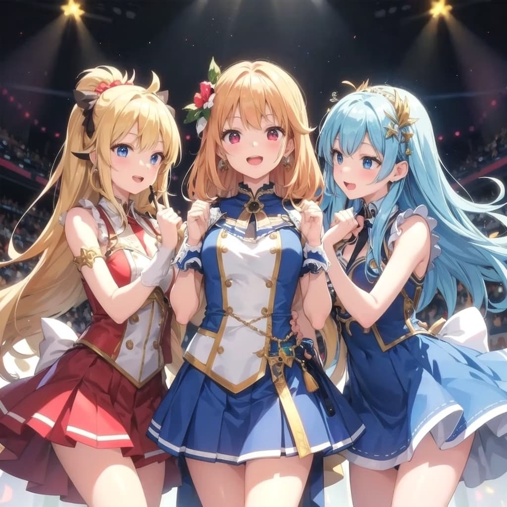 high quality, highly detailed, the central theme expresses otherworldly, fantastical characters, there three girls on the stage, (1girls:1.1), (1girls:1.1), (1girls:1.1)16 years old, idol, dancing, now just in singing, on the stage, gorgeous staging, slender, smile, friendly relationship, dazzling lights, extremely detailed eyes and face, pretty, (perfect hands:1.1), (perfect legs:1.1), shoot side by side, upper body shot, diagonal angle, they extremely shouting,