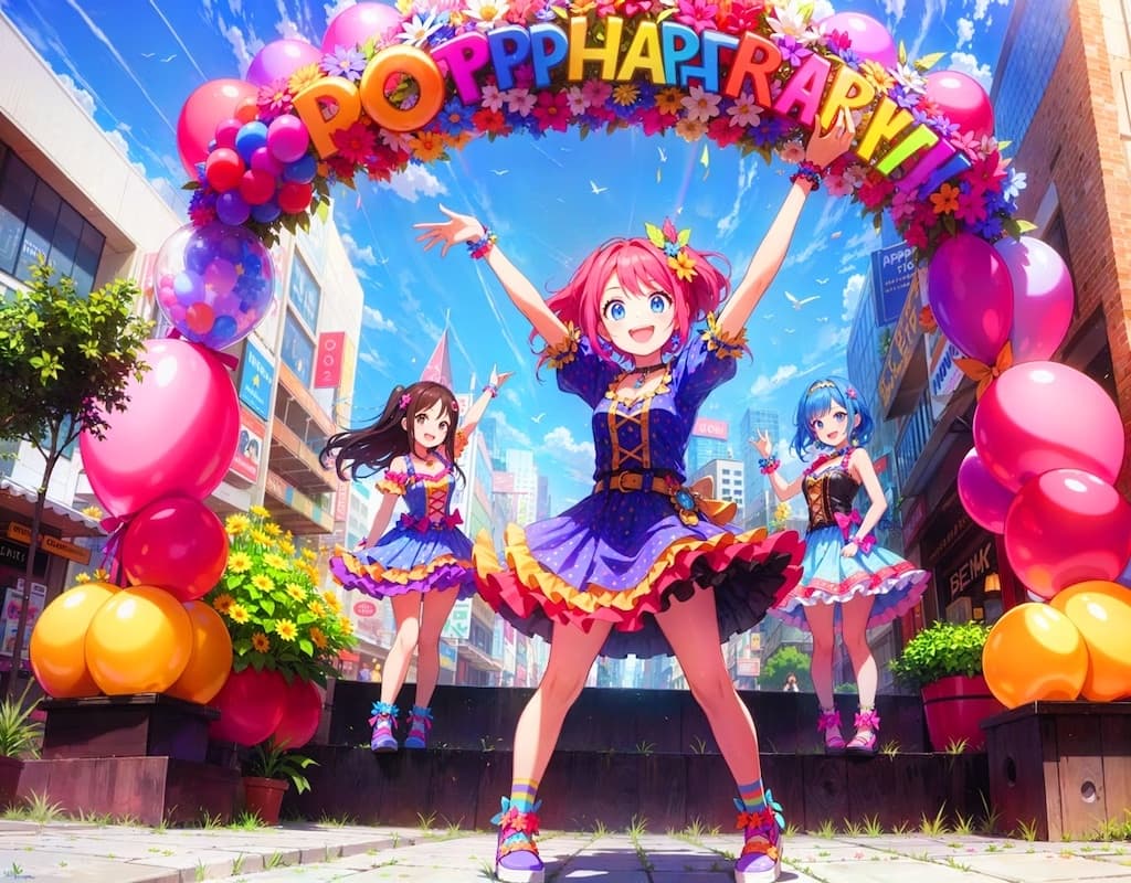 (group:1.2) of (idol:1.35) girls singing on (little:0.9) (stage:1.25) in open air in (japanese:0.4) (Downtown:1.3) Plaza, looking at viewer, (smile, happy), (shopping arcade:0.6), (focus on girls), daytime, Idol Costumes, (front view:1.3), (close up:0.75),balloon arch (gate:0.2),