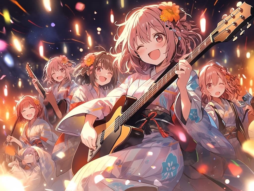 Delicate digital illustration, high contrast, Japanese style girl idols singing, guitar, shamisen, seven - colored fireworks shining in abundance, rainbow - colored penlights, dark background, kaleidoscope effect
