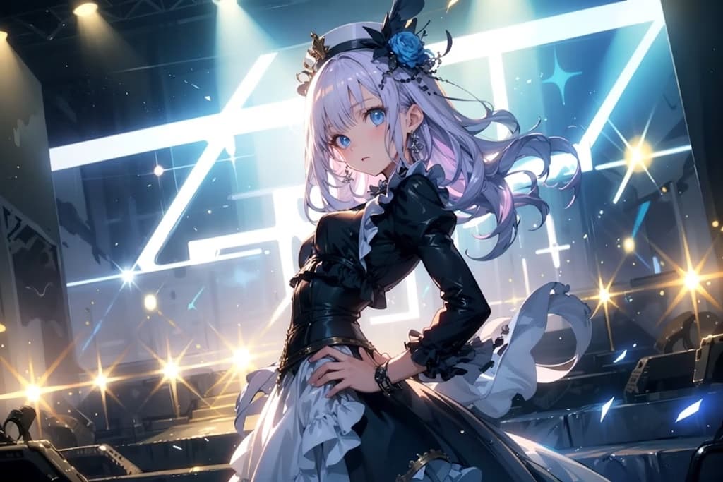 best quality, masterpiece, (intense angle:1.1), (face front:1.3), (Portrait:1.2), cute pose, 1girl, solo, highly detailed beautiful face and eyes, normal breasts, (expressionless:1.2), long hair, hairs between eyes, (light purple hair:1.3), (blue eyes:1.2), (white idol costume, frills skirt, extremely small white silk hat:1.2), Lots of earrings, (small eyes, narrow eyes:1.2), (on the stage, night:1.3), (put hand on the hip:1.2)
