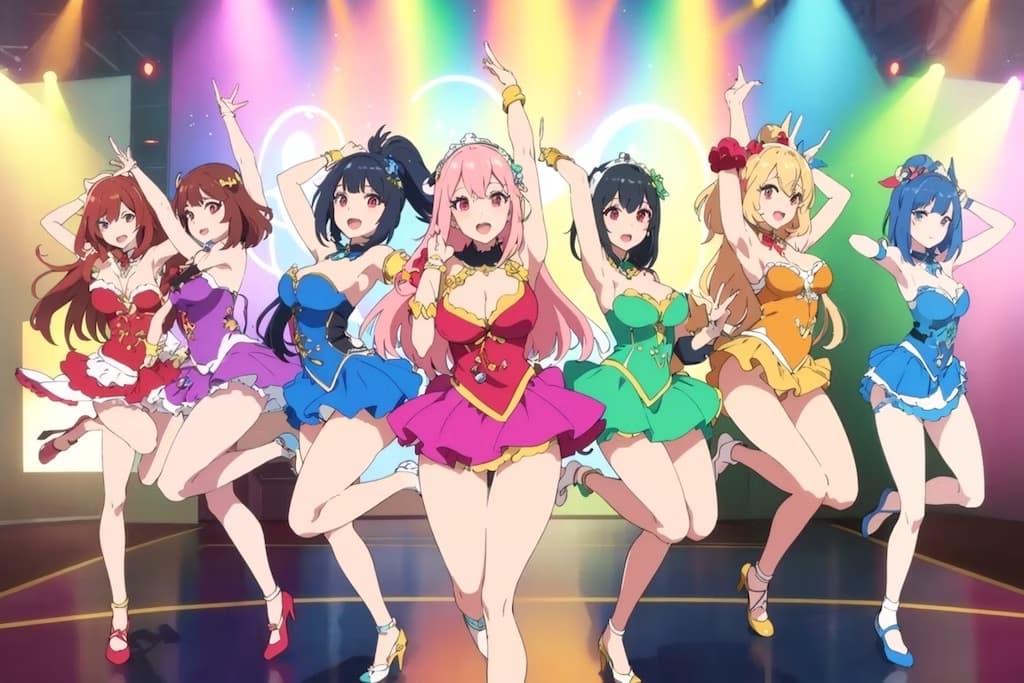 Masterpiece, high quality, super high resolution, super detailed, group shot, (female idol group 7), smile, bridge