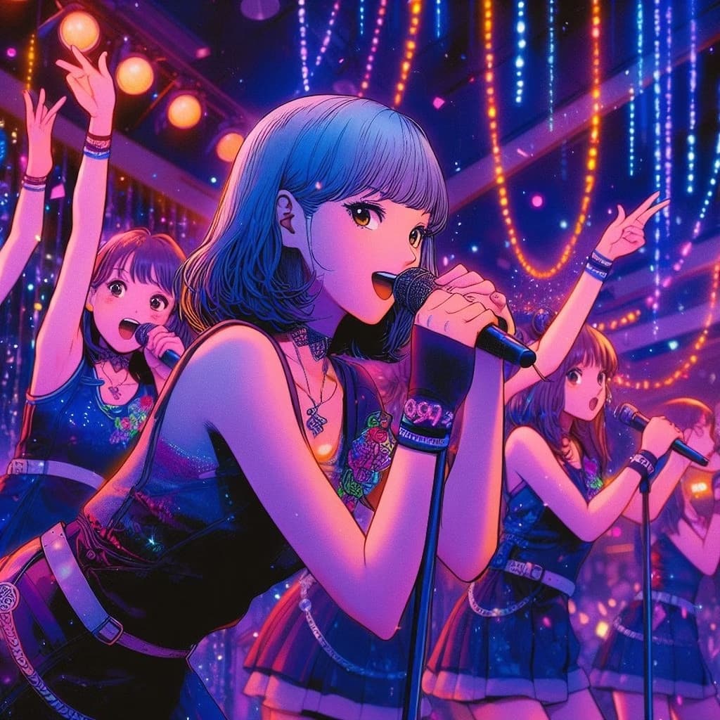 1988年の日本のアイドルがファンクバンドで歌う。ネオン輝くキラキラの雰囲気。当時のアニメの画風で。