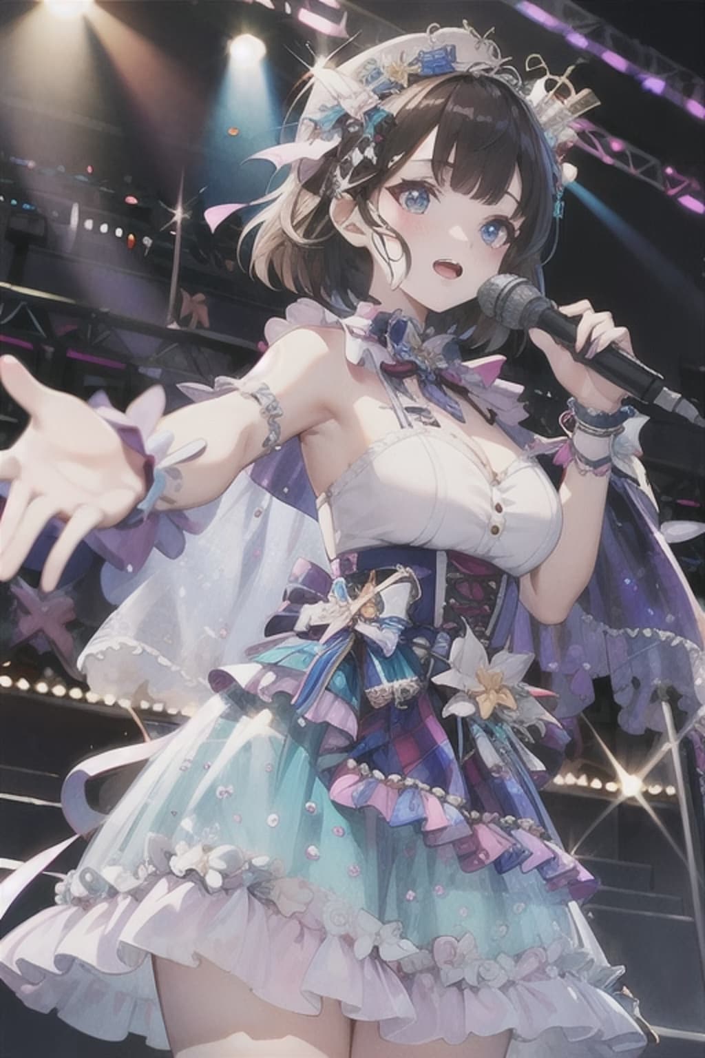 girl, large breasts, shorthair, 17years old, open mouth, singing, from below, front view, stage, live, spotlight, indoor, detailed, beautiful detailed eyes,indoor, {{{{{detailed face}}}}}, photorealistic, detailed body, ultra-detailed, best quality, beautiful detailed eyes, cinematic lighting, super detailed skin, idol_singing_costume, idol_singing_costume, idol_singing_costume