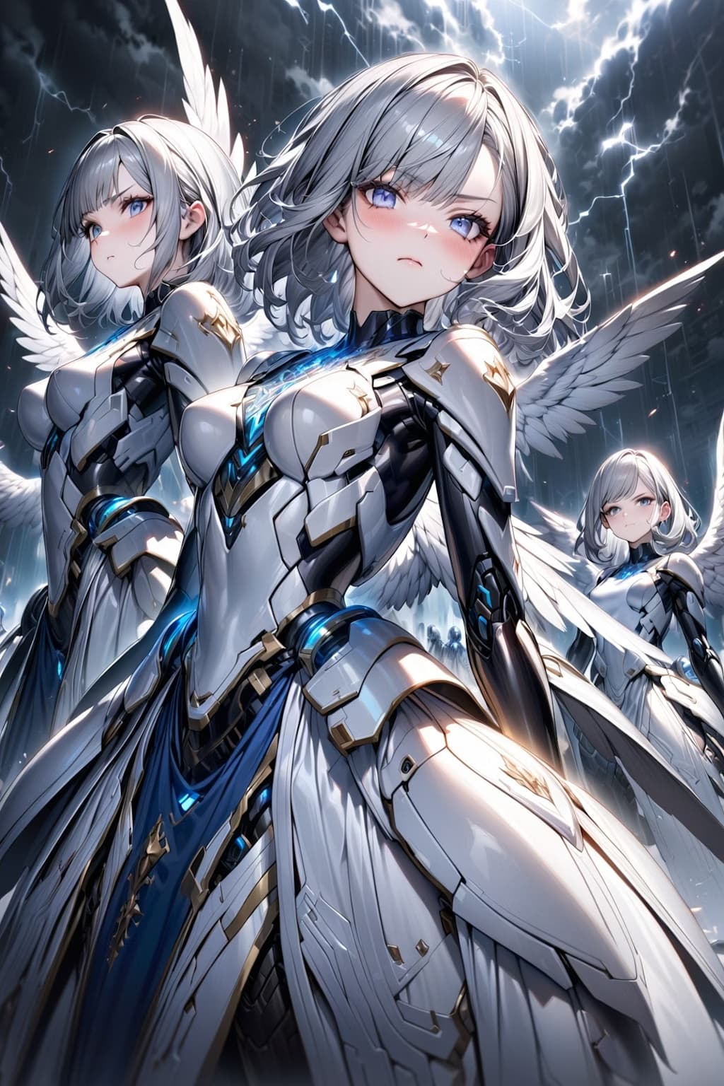 (serious expression:1.1), This image shows three winged female androids spreading their wings and flying in the sky against a dark cloudy sky with a large thunderstorm running through it. They are flying in the foreground, preparing for the upcoming battle with grim expressions on their faces.