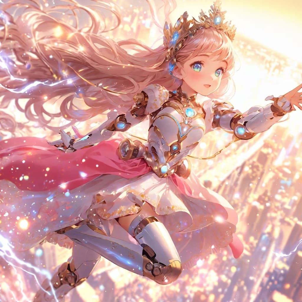 (adolescence girl), (loli, petite), A beautiful robot princess, wearing the brilliance of the aurora, runs through the night city. The aurora’s light spreads around her, and its beauty envelops the surroundings like magic. And at the center of that scene stands a beautiful robot princess. She runs gracefully, giving courage and hope to the people around her.
