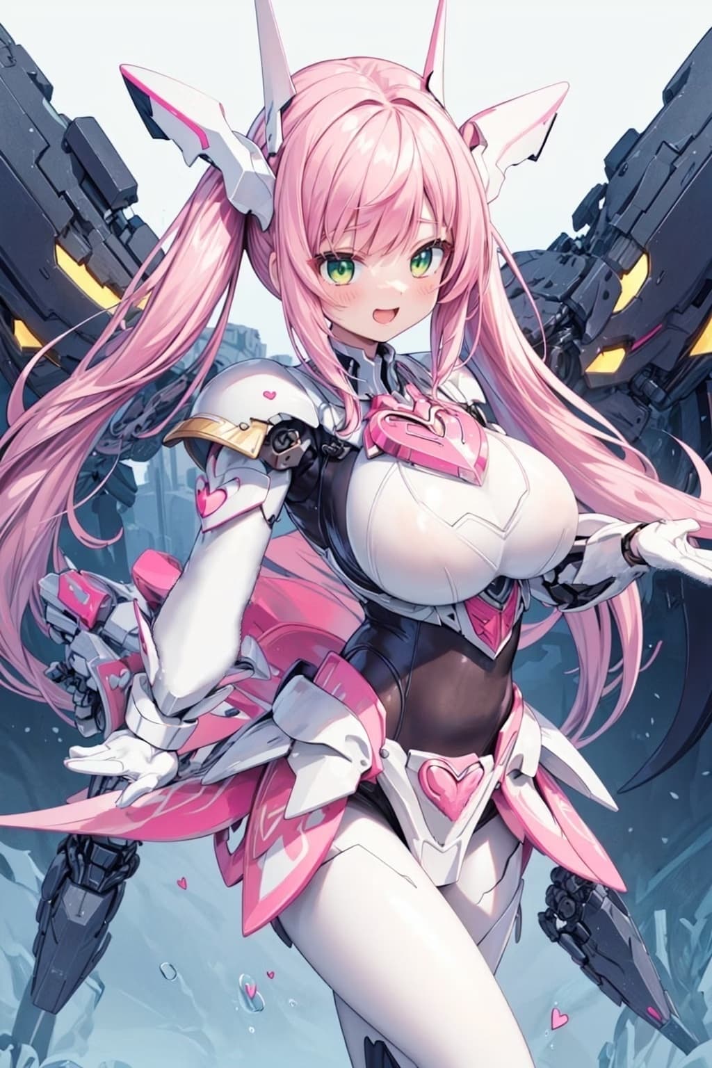 Mecha musume, vivid pink hair, mecha arms, mecha legs, mecha dinner uniform, (heart hair ornaments), long hair, twin tails, green eyes, laughing, cheerful, parky, (big heart shaped breastplate:1.5), white and vivid pink armor, (black bodysuit), (mechanical white and vivid pink tutu skirt), Silver tray, in dinner, masterpiece, Top quality, super dense, dynamic pose, mecha musume, headgear, mechanical arms, bodysuit