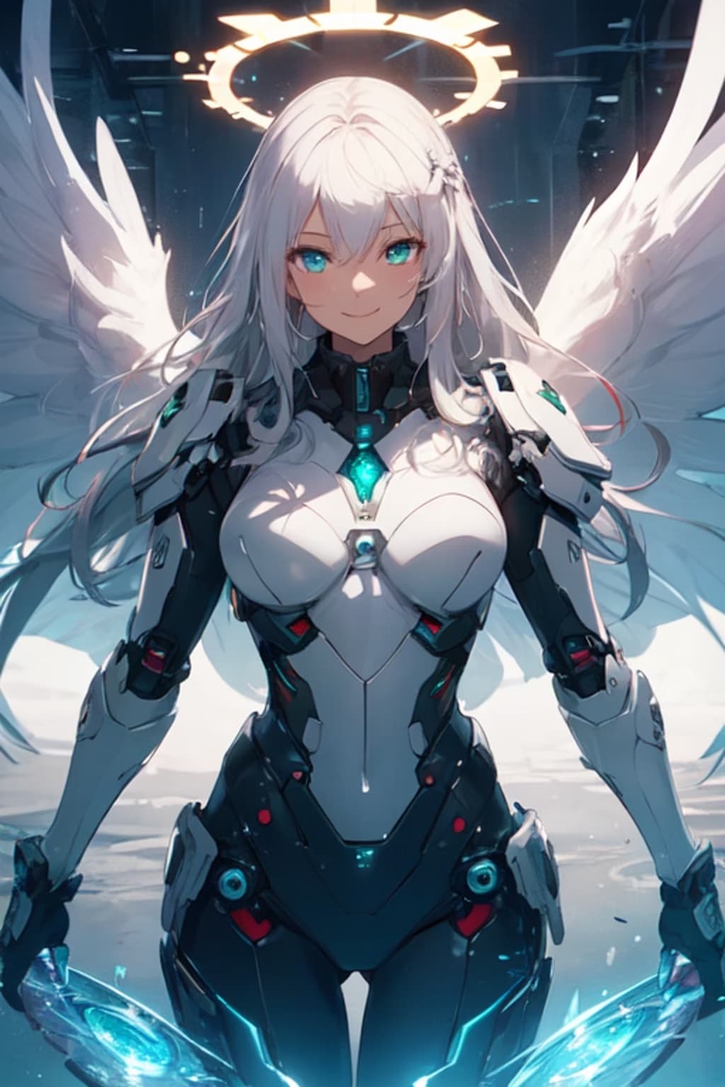 ((masterpiece)), ((best quality)), (ultra-detailed), ((extremely detailed)), 4K, (8K), best quality, (beautiful), extremely detailed game CG, sacred place, magic circle, luminous effectl, sparkling effect, cowboy shot, stylish pose, a cute girl, 1girl, solo, robot suit, robot, angel halo, wings, beautiful white hair, beautiful green eyes, ((beautiful eyes)), long hair, light smile