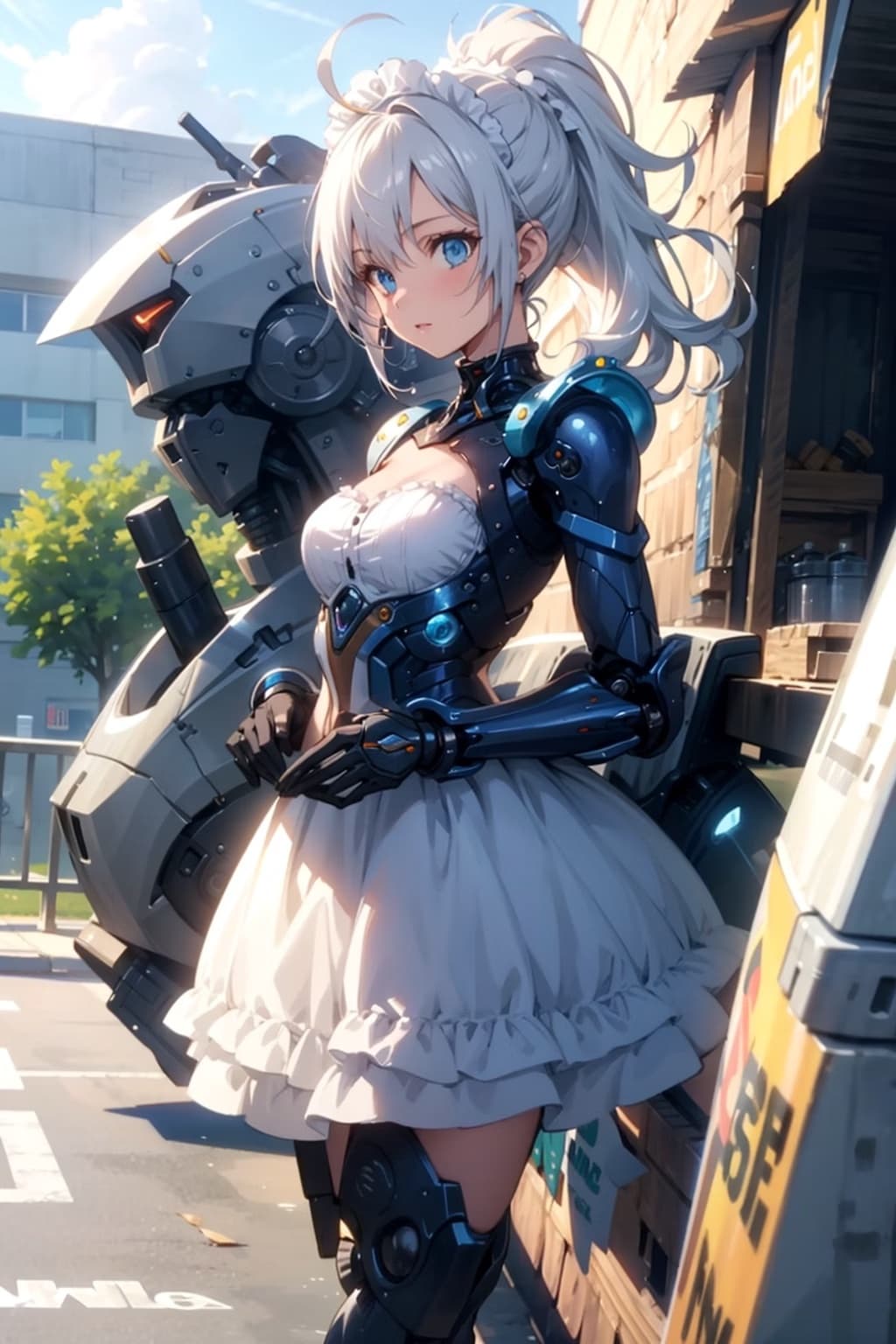 1girl, maid, ponytail, ahoge, silver hair, blue eyes, maid clothes, white backgroundbest quality, ultra detailed 8k cg render, masterpiece, high resolution, extremely detailed,1 girl, mechanical shoulder, mechanical leg, headgear, mecha suit, mecha musume,