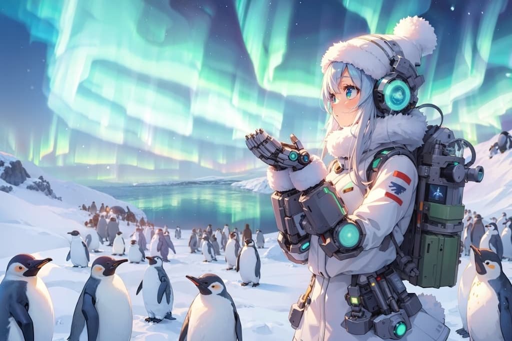 a robot girl wearing winter clothes, machanical joints, breathing out (aurora from its hands:1.4), standing on a snowy hill in Antarctica, surrounded by penguins and seals,