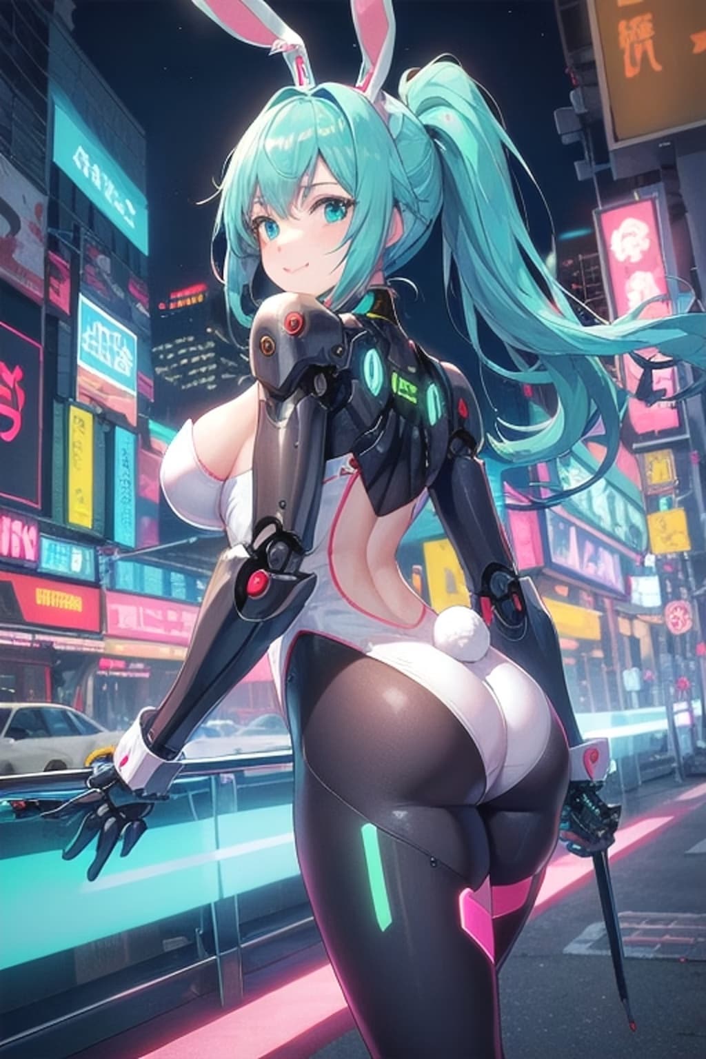 cyberpunk, blade runner,building,((neon city)),((suit color is white and aqua)),((cyber bunny girl suit)), ((headgear with mechanical bunny ears)), mechanical armor,robotics arms,1girl, big breasts, glamorous body,ponytail hair,cowboy shot,smile,((jumping action)),mecha musume,from behind,