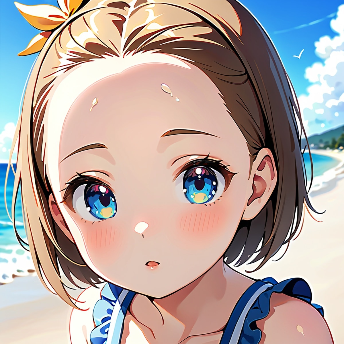 One girl, 12years old, forehead fully visible, glistening forehead, broad forehead, forehead visible, very short hair, bangs cut very short, bangs swept back, white dress, close-up of face, beach, blue sky in background BREAK. Masterpiece, top quality, high resolution, ultra-detailed, 8K, beautiful work.