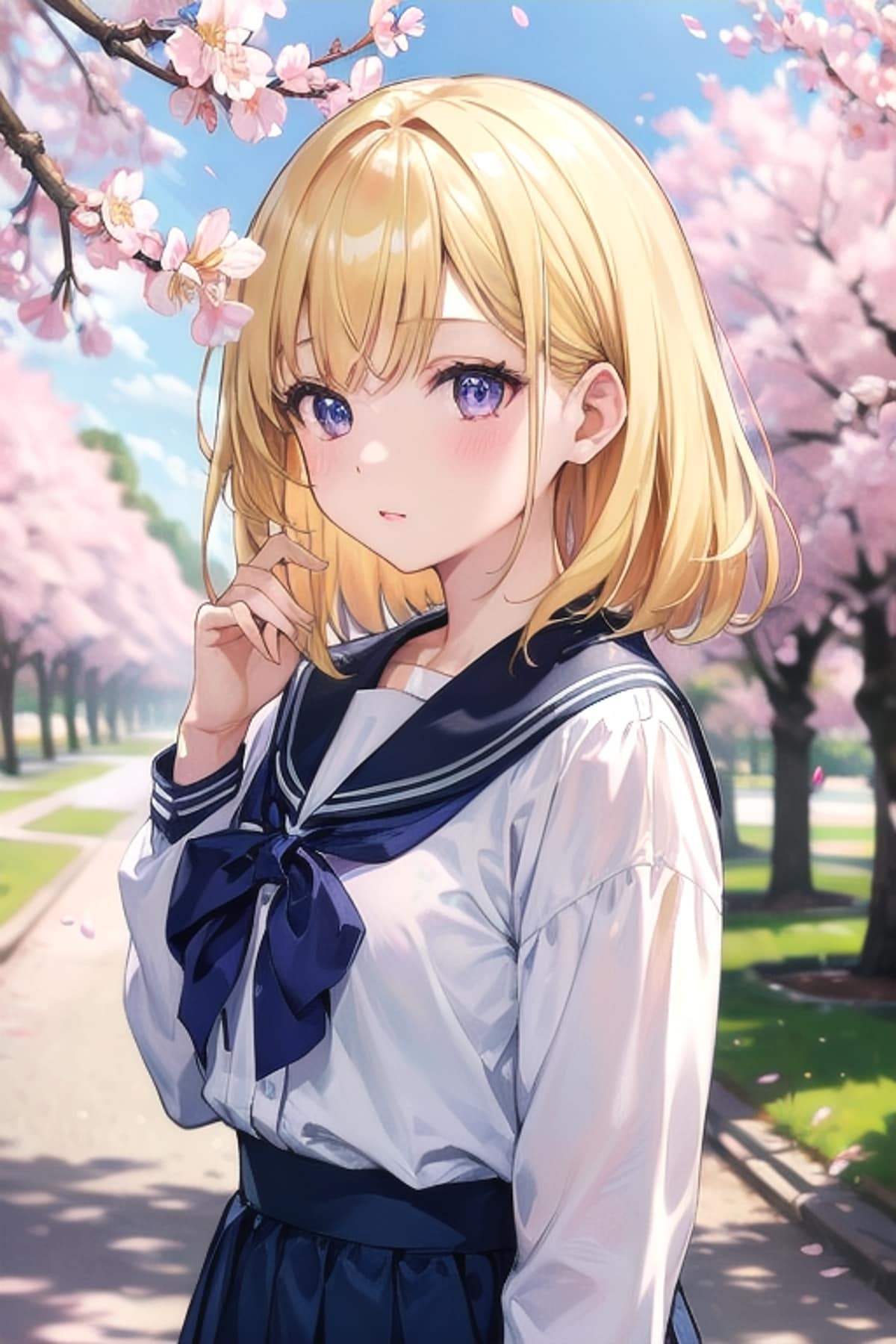 fairy ,blonde hair ,beautiful, masterpiece, best quality, wrapped in light extremely detailed face, perfect lighting, (absurdres), (ultra detailed, 8K, ultra highres:1.2), perfect lighting, (1child girl:1.0), spring, cherry blossoms, Walk along the cherry blossom trees, high school girl BREAK,