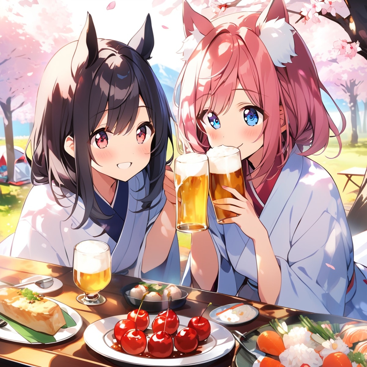 2 cute girls, cherry blossom viewing, drinking beer, hors d'oeuvre, happy smile, red face, camping sheet, lots of dishes, sakurafubuki