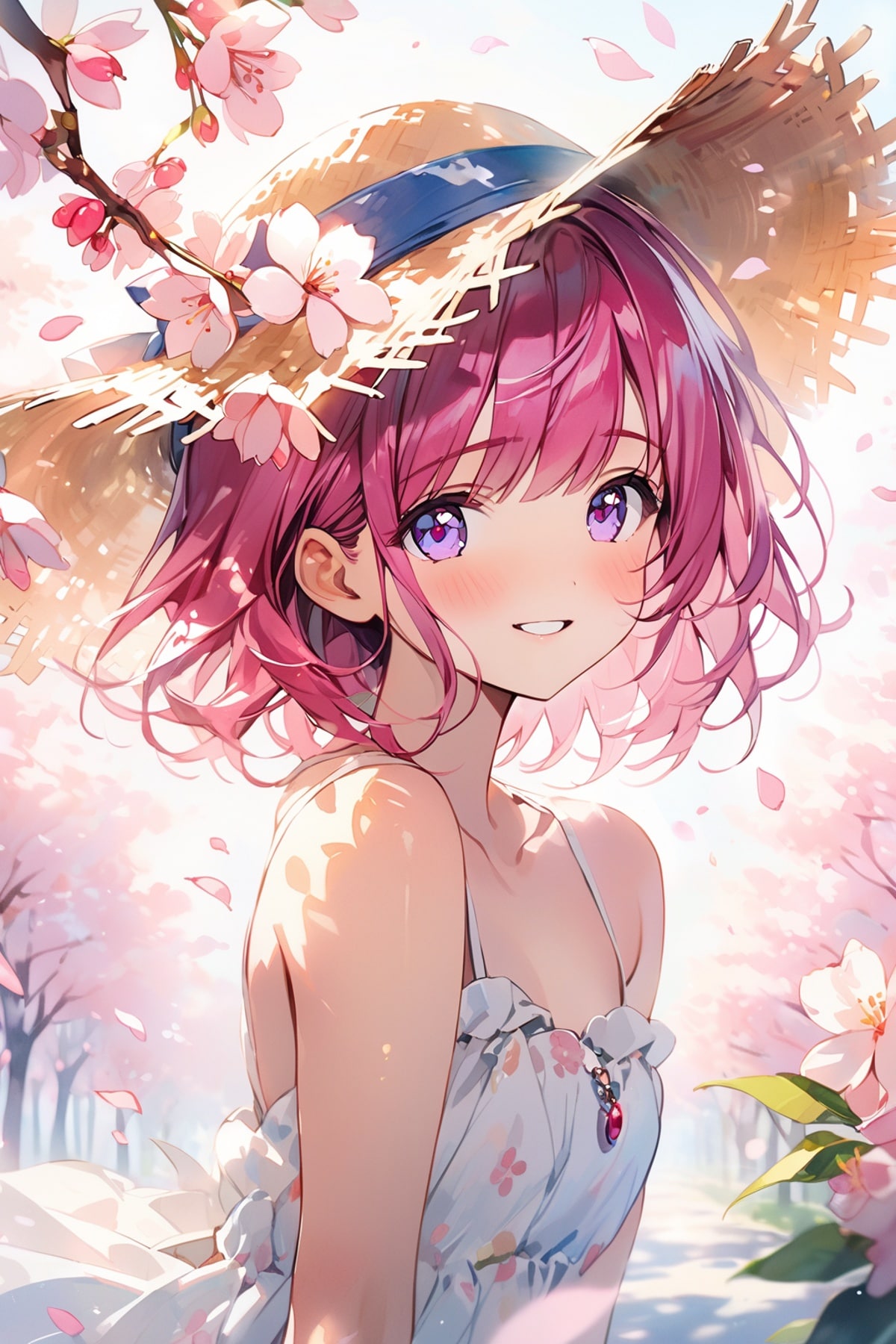 Beautiful girl, flat chest, cherry blossoms, short hair, fuchsia hair, white dress, straw hat, looking at cherry blossoms, happy, watercolor, retouching, masterpiece, high quality, pastel colors, gentle light, cute pendant, cherry blossom blizzard, naughty smile