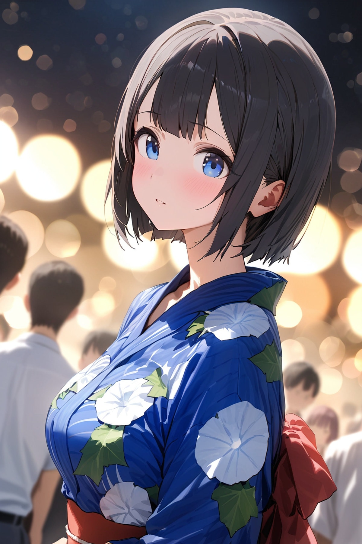 masterpiece, best quality,ultra-detailed,8K,very aesthetic,1girl,15yo, large breasts,morning glory print yukata, black hair, blunt bob cut, straight hair, blush, shy, japanese summer festival, night, (bokeh:1.3), upper body, dynamic angle,