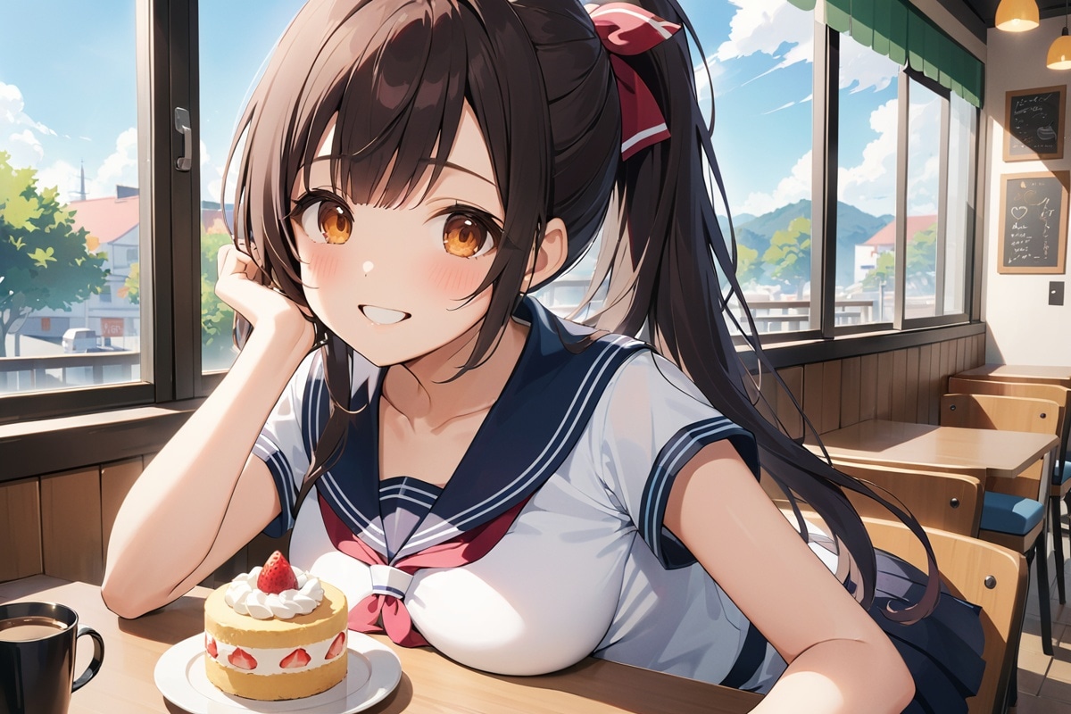 1 pretty girl, 18 yers old,black hair,ponytail,breasts size B cup,happy smile, sailor school uniform, cafe,she have a coffee cup,There is a cute cake,4k, best quality,